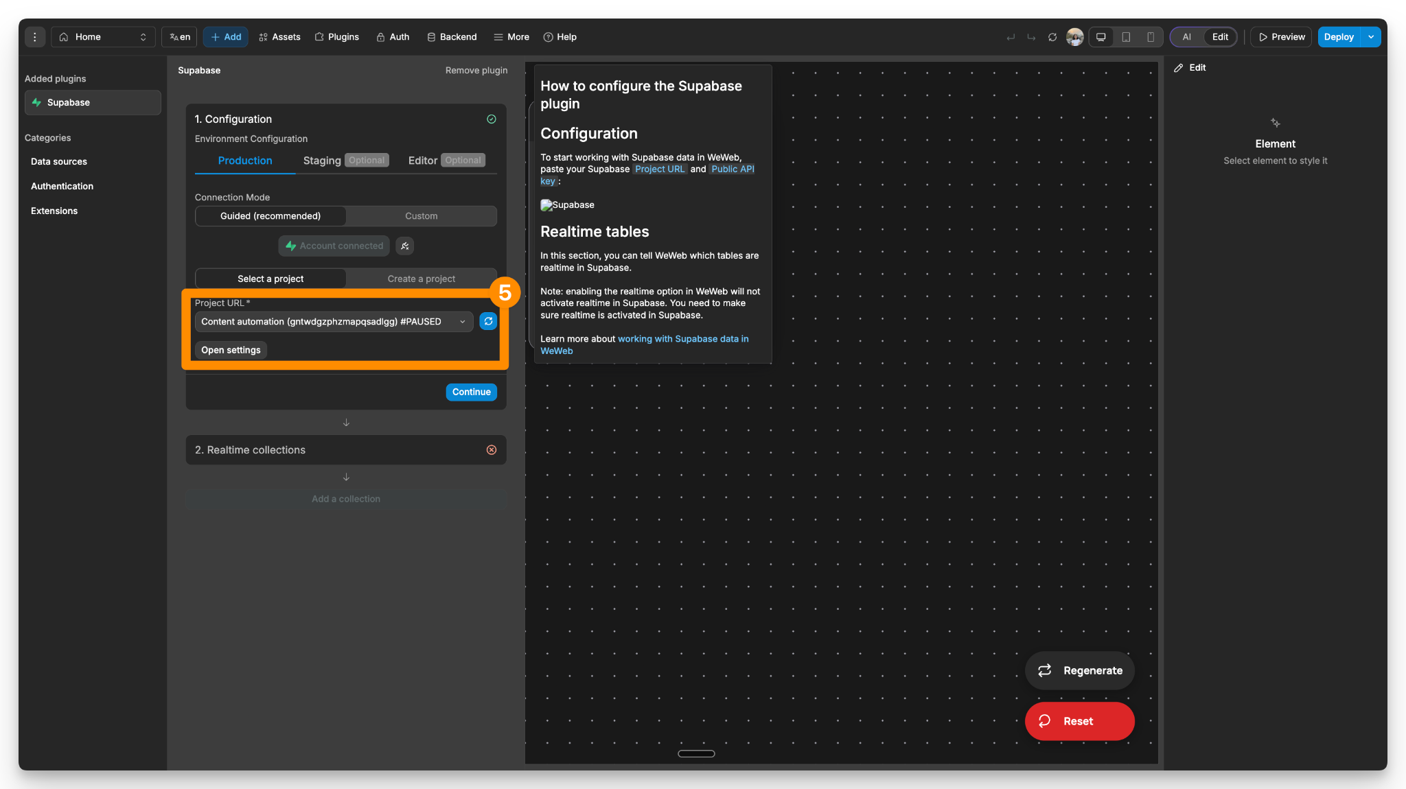 Click on “Connect Supabase” and Authorize WeWeb AI to manage your Supabase backend: