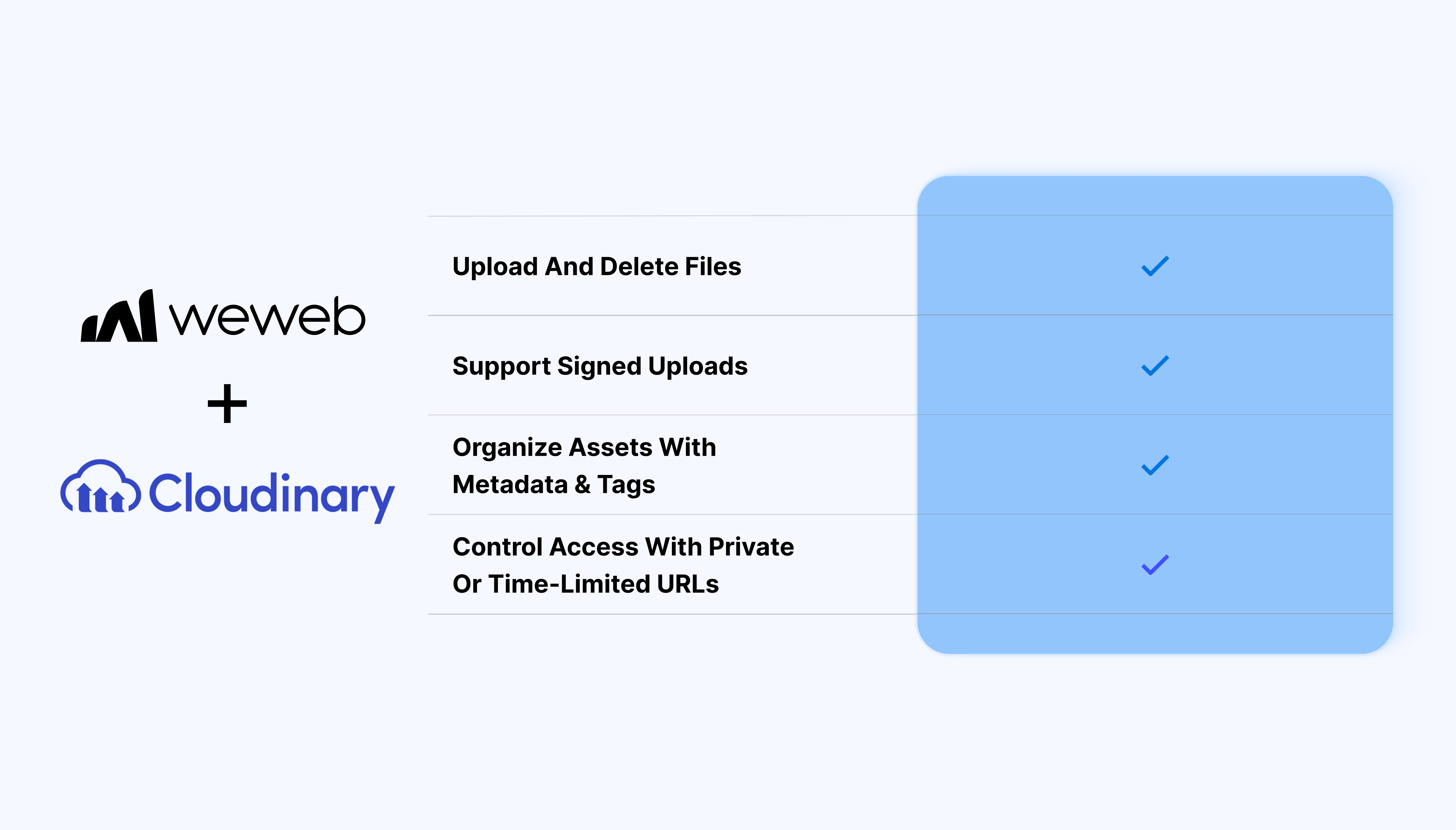 Cloudinary handles media storage and delivery. WeWeb gives you the interface, workflows, and logic to turn that into a complete product experience.