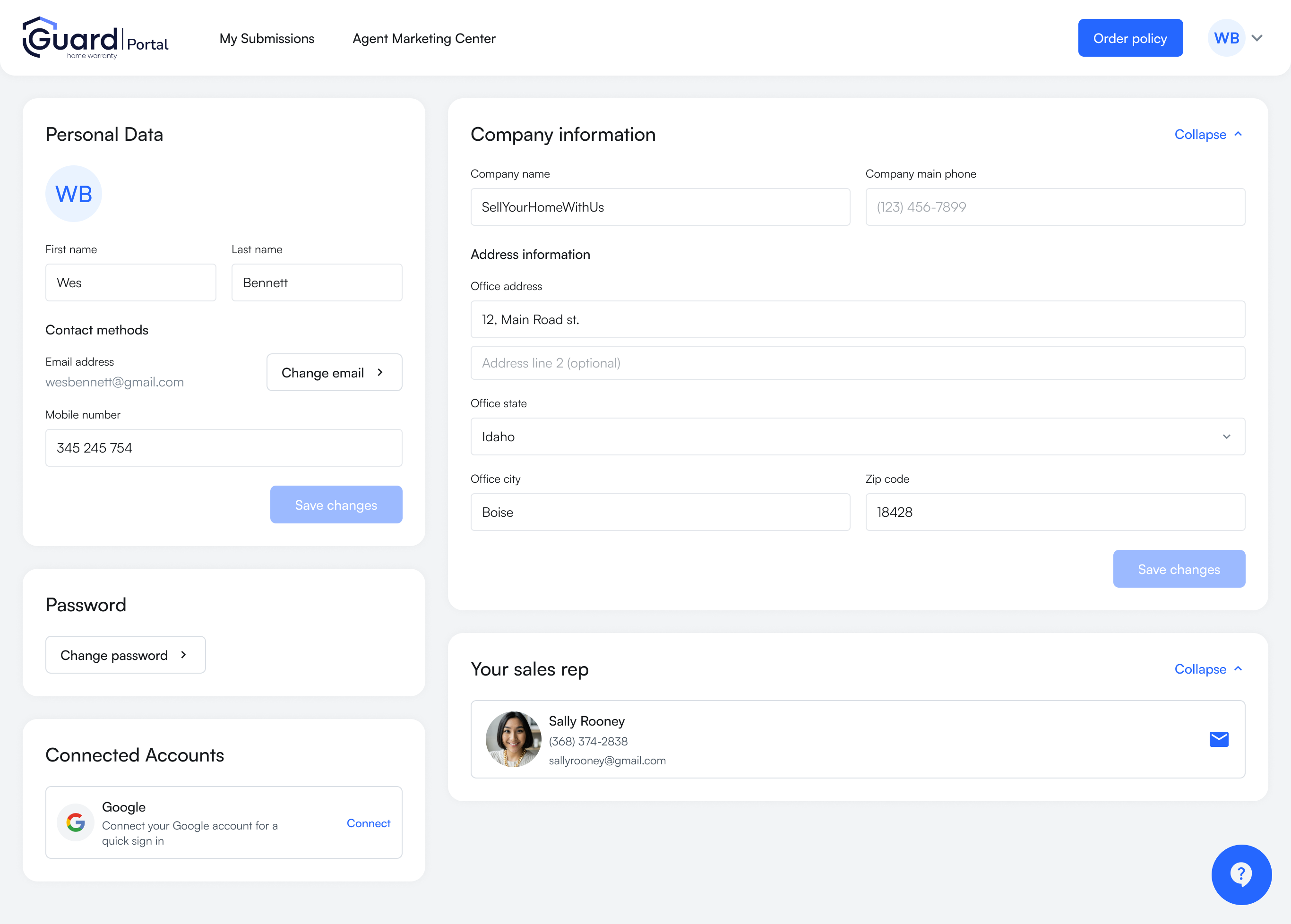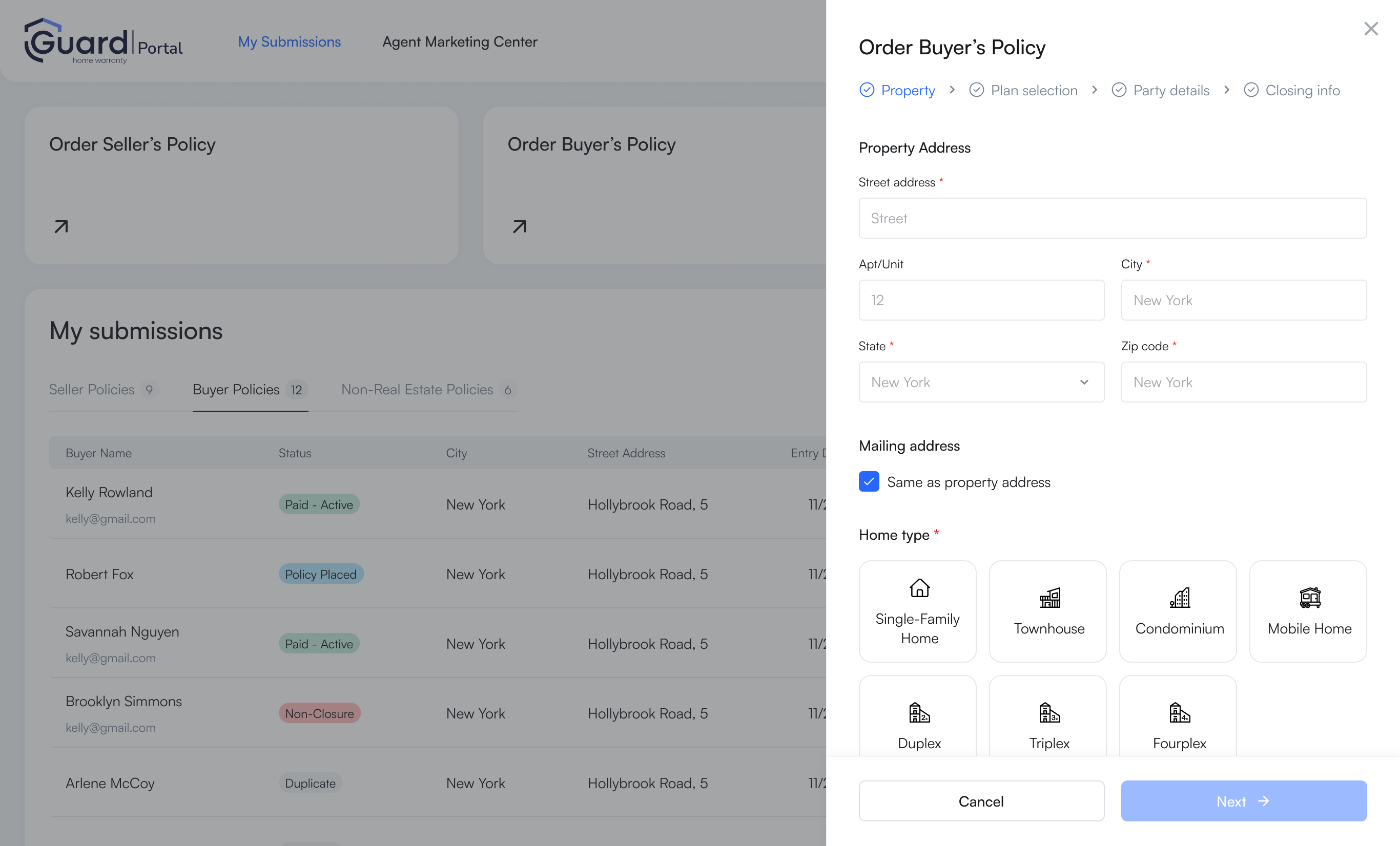 Realtor flows: Create an account, order warranties (seller’s, buyer’s, non‑real‑estate), manage submissions, and access the Agent Marketing Center.