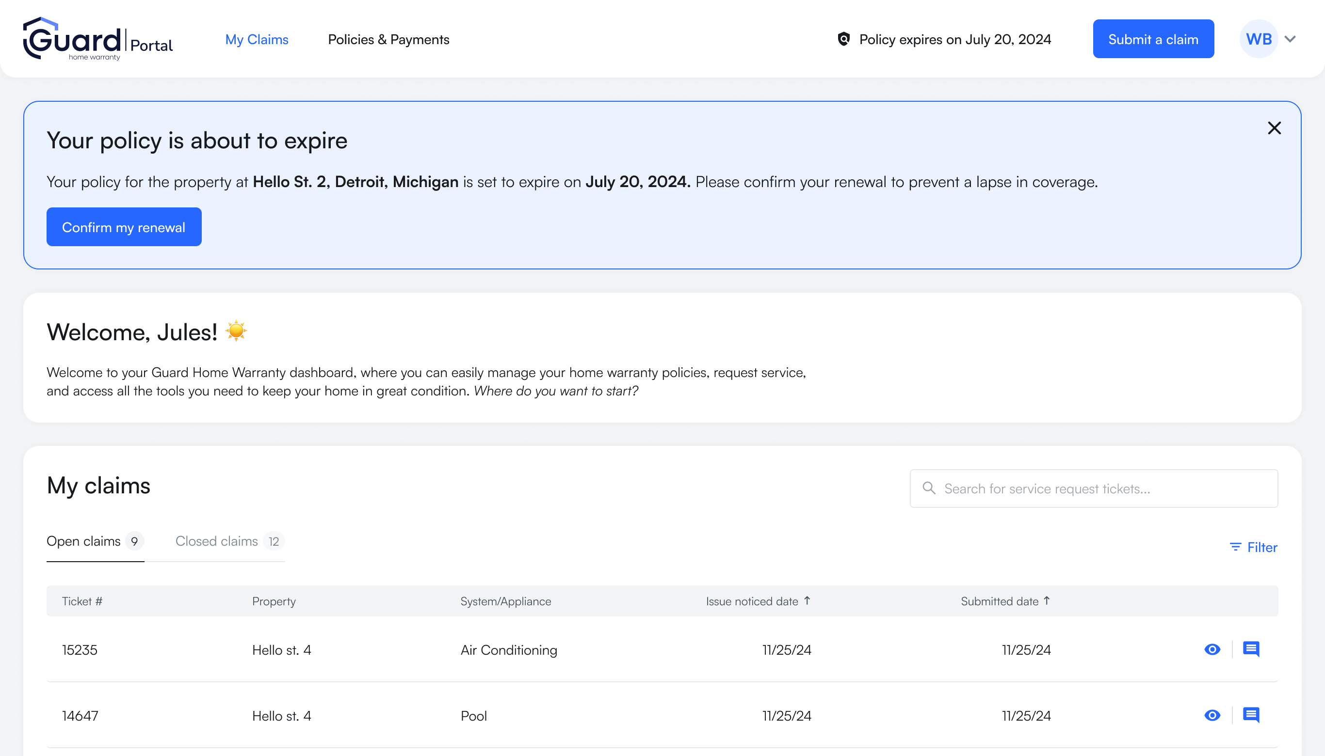 The platform helps homeowners, real‑estate professionals, inspectors, and the internal GHW team file claims, register or order policies, and manage accounts, all within a trusted, mobile‑first brand experience.