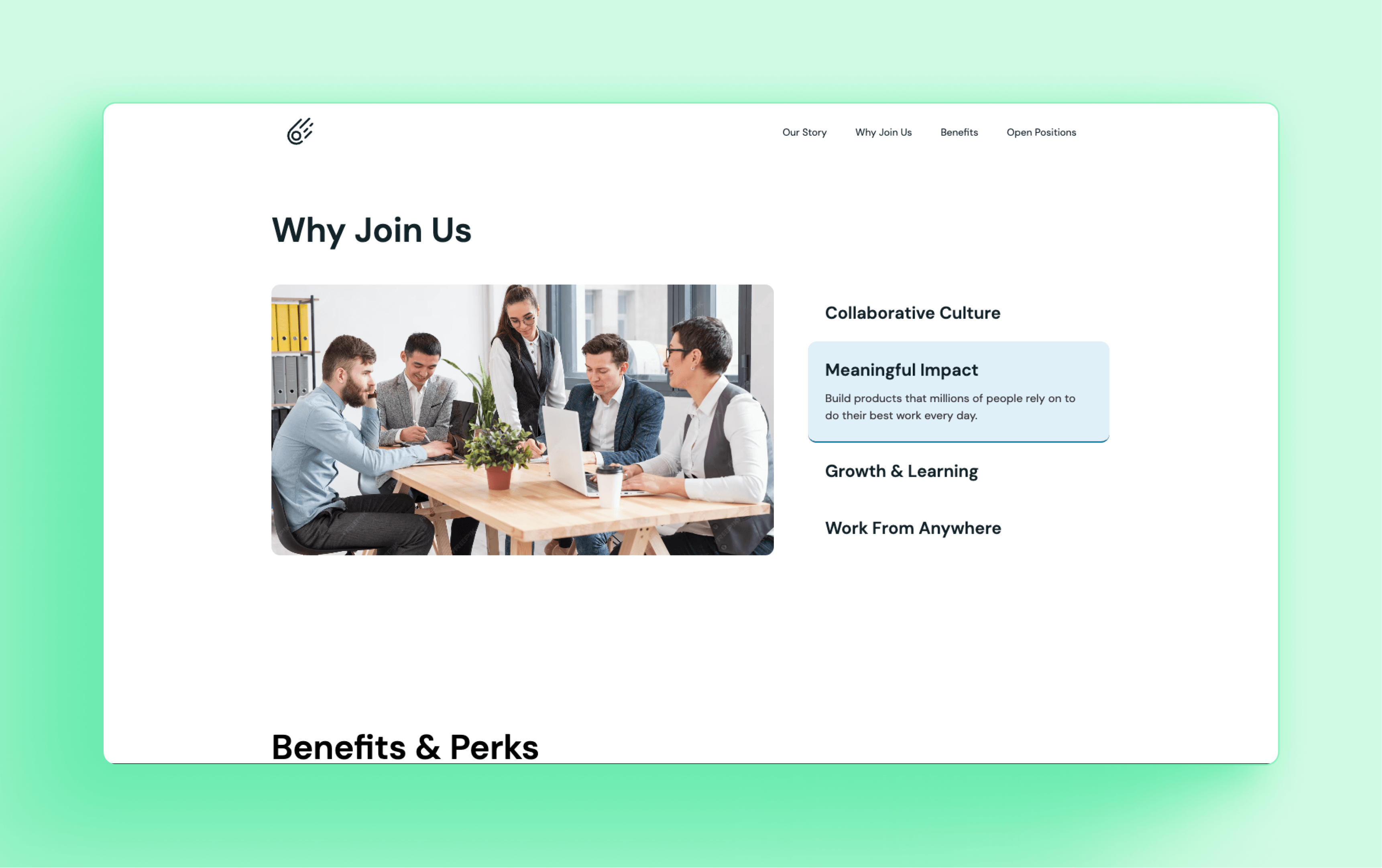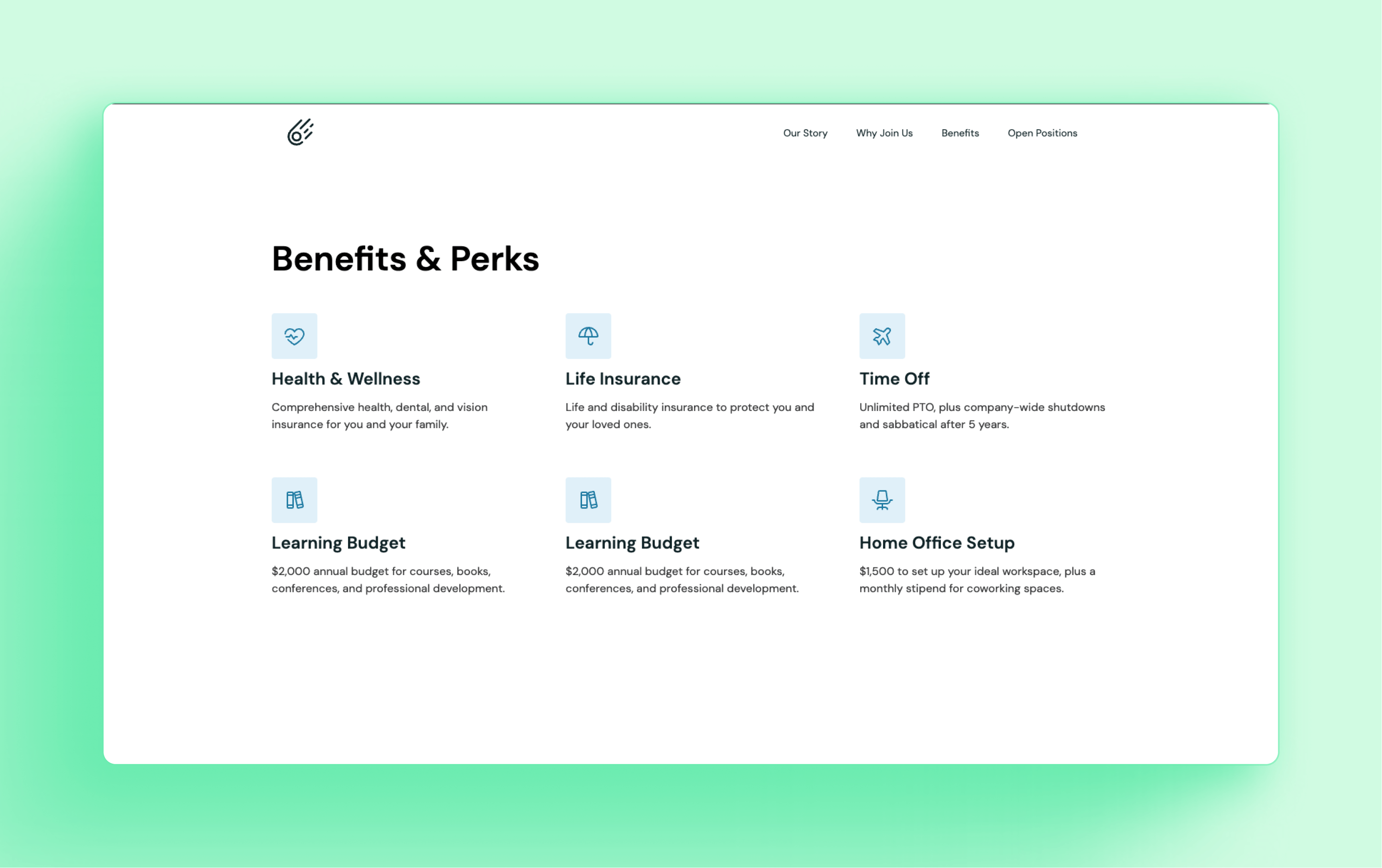 The Careers Page template helps you build a branded hub for open roles and company culture. Whether you’re a fast-growing startup or an established enterprise, this template makes it easy to display job openings, share your story, and connect candidates to your team.